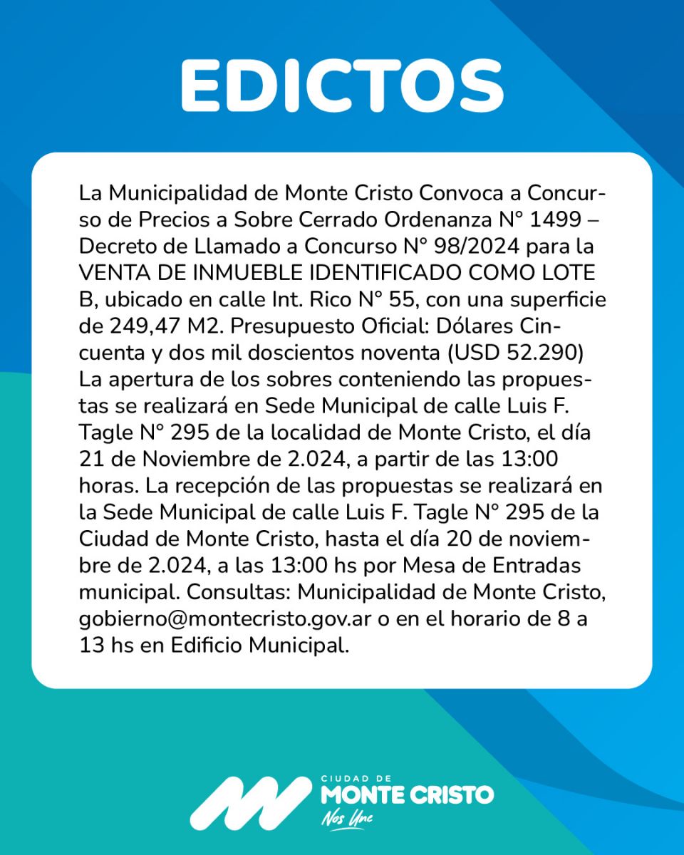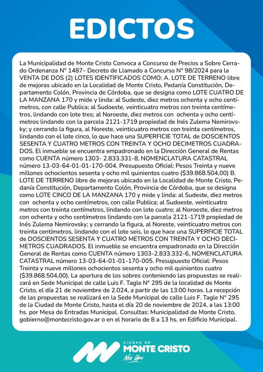 Edictos: Venta de Inmuebles - Municipalidad de Monte Cristo Córdoba Argentina