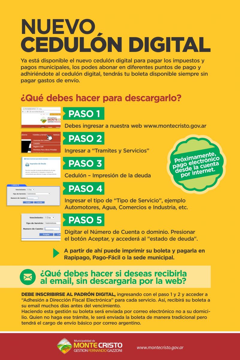 NUEVO CEDULÓN DIGITAL Ya está disponible el nuevo cedulón digital para pagar los impuestos y pagos municipales, los podes abonar en diferentes puntos de pago y adhiriéndote al cedulón digital, tendrás tu boleta disponible siempre sin pagar gastos de envío. ¿Que debes hacer para descargarla? Paso 1. Debes ingresar a nuestra web www.montecristo.gov.ar Paso 2. Ingresar a “Tramites y Servicios” Paso 3. Cedulón – Impresión de la deuda Paso 4. Ingresar el tipo de “Tipo de Servicio”, ejemplo Automotores, Agua, Comercios e Industria, etc. Paso 5. Digitar el Número de Cuenta o dominio. Presionar el botón Aceptar, y accederá al "estado de deuda". A partir de ahí puede imprimir su boleta y pagarla en Rapipago, Pago- Fácil o la sede municipal. ¿Qué debes hacer si deseas recibirla al email, sin descargarla por la web? DEBE INSCRIBIRSE AL PADRÓN DIGITAL, ingresando con el paso 1 y 2 y acceder a “Adhesión a Dirección Fiscal Electrónica” para cada servicio. Así, recibirá su boleta a su email muchos días antes del vencimiento. Haciendo esta gestión su boleta será enviada por correo electrónico no a su domicilio. Quien no haga ese trámite, le será enviada la boleta de manera tradicional pero tendrá el cargo de envío básico por correo argentino. PRONTO SE PODRÁ HACER PAGO ELECTRONICO POR LA WEB